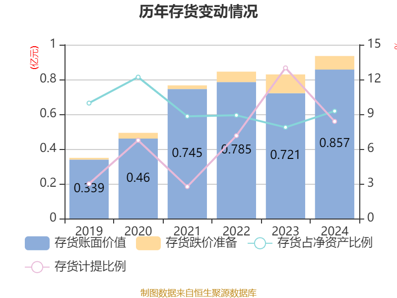 从存货变动来看,截至2024年末,公司存货账面价值为8568.2万元,占净资产的9.27%,较上年末增加1356.58万元。其中,存货跌价准备为783.85万元,计提比例为8.38%。