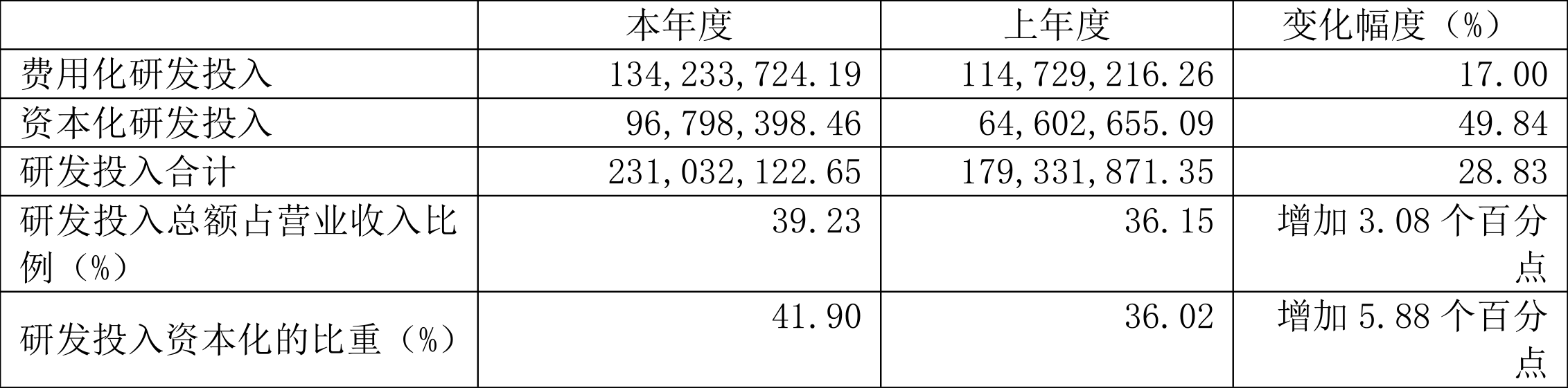 2024年全年,公司研发投入金额为2.31亿元,同比增长28.83%;研发投入占营业收入比例为39.23%,相比上年同期上升3.08个百分点。此外,公司全年研发投入资本化率为41.9%。