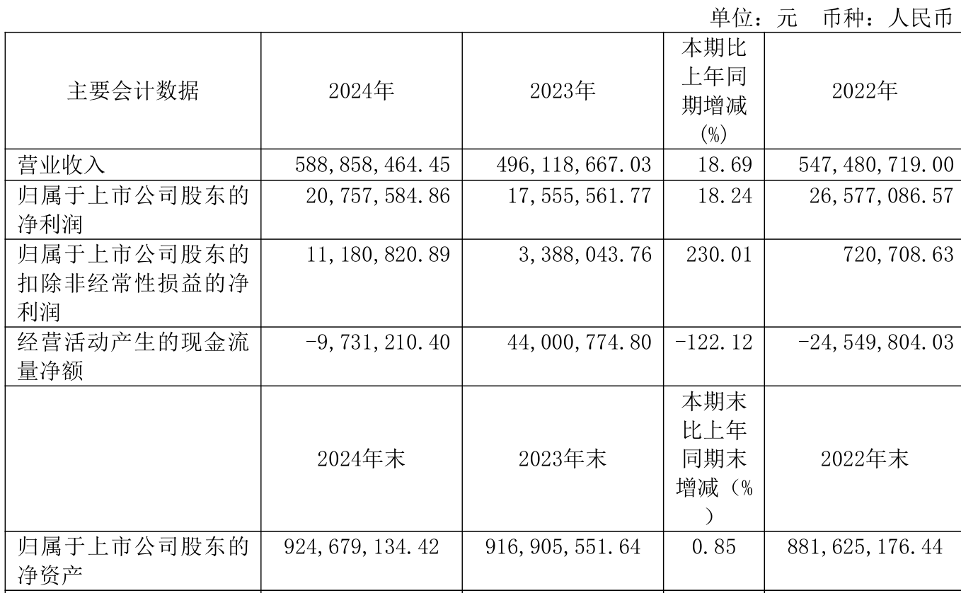 中证智能财讯欧林生物(688319)3月29日披露2024年年度报告。2024年,公司实现营业总收入5.89亿元,同比增长18.69%;归母净利润2075.76万元,同比增长18.24%;扣非净利润1118.08万元,同比增长230.01%;经营活动产生的现金流量净额为-973.12万元,上年同期为4400.08万元;报告期内,欧林生物基本每股收益为0.0512元,加权平均净资产收益率为2.24%。