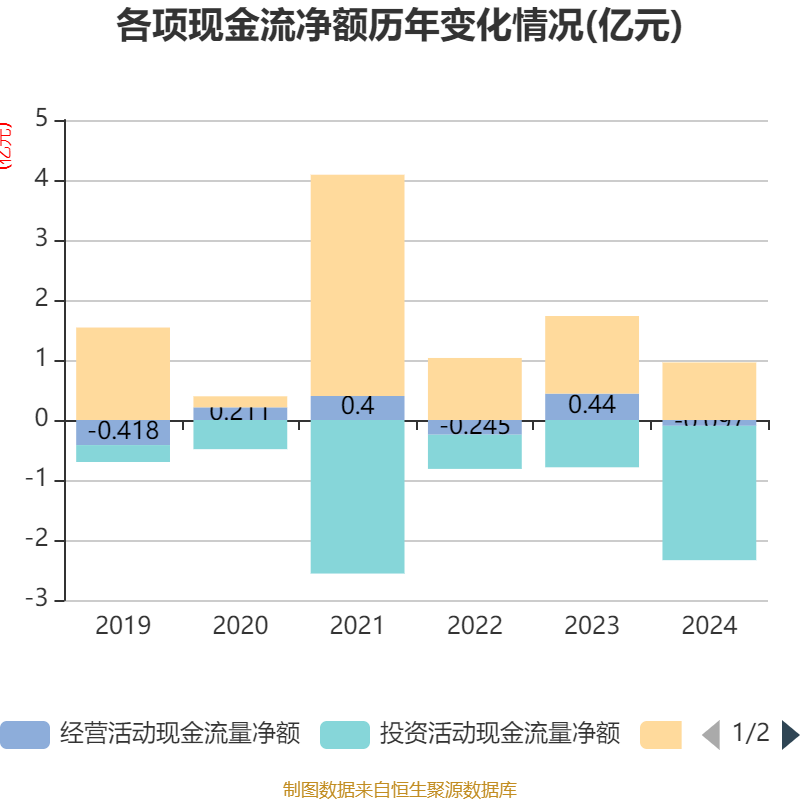 截至2024年,公司经营活动现金流净额为-973.12万元,同比减少5373.2万元;筹资活动现金流净额9590.74万元,同比减少3335.93万元;投资活动现金流净额-2.24亿元,上年同期为-7884.31万元。