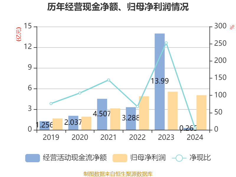 中证智能财讯赢合科技(300457)3月29日披露2024年年度报告。2024年,公司实现营业总收入85.24亿元,同比下降12.58%;归母净利润5.03亿元,同比下降9.14%;扣非净利润4.96亿元,同比下降7.44%;经营活动产生的现金流量净额为2650.62万元,同比下降98.11%;报告期内,赢合科技基本每股收益为0.78元,加权平均净资产收益率为7.89%。公司2024年度分配预案为:拟向全体股东每10股派现1.17元(含税)。