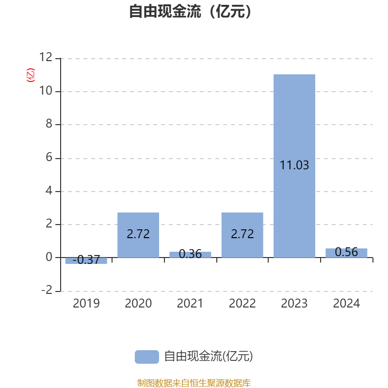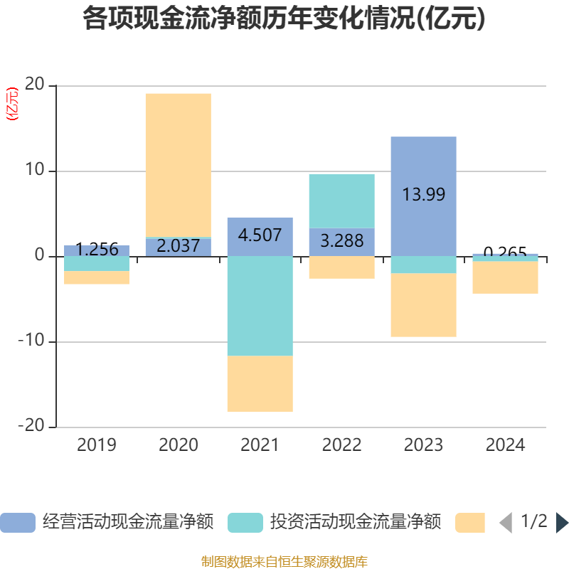 截至2024年,公司经营活动现金流净额为2650.62万元,同比下降98.11%;筹资活动现金流净额-3.77亿元,同比增加3.66亿元;投资活动现金流净额-6384.43万元,上年同期为-2.04亿元。