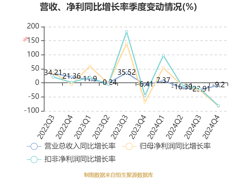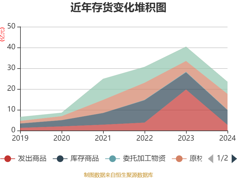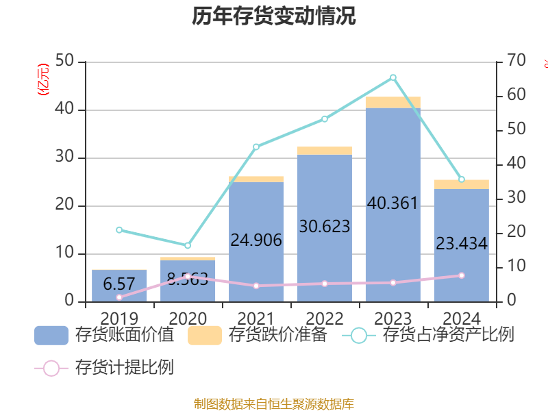 从存货变动来看,截至2024年末,公司存货账面价值为23.43亿元,占净资产的35.64%,较上年末减少16.93亿元。其中,存货跌价准备为1.92亿元,计提比例为7.56%。
