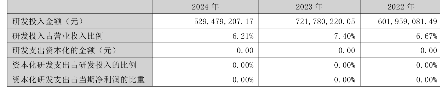 2024年全年,公司研发投入金额为5.29亿元,同比下降26.64%;研发投入占营业收入比例为6.21%,相比上年同期下降1.19个百分点。此外,公司全年研发投入资本化率为0%。