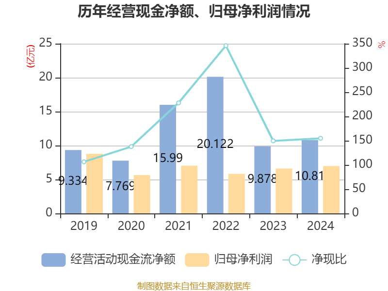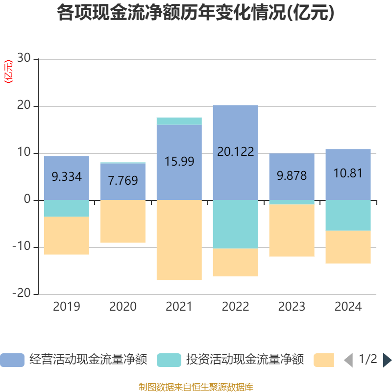 截至2024年,公司经营活动现金流净额为10.81亿元,同比增长9.43%;筹资活动现金流净额-6.97亿元,同比增加4.09亿元;投资活动现金流净额-6.54亿元,上年同期为-9785.9万元。