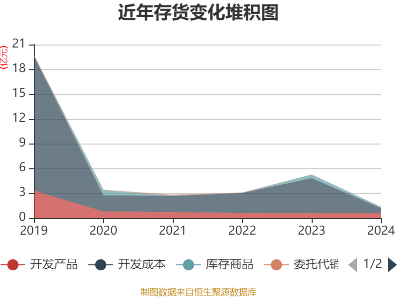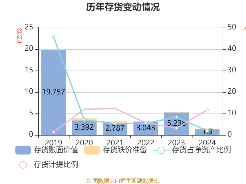 从存货变动来看,截至2024年末,公司存货账面价值为1.3亿元,占净资产的1.89%,较上年末减少3.94亿元。其中,存货跌价准备为1719.03万元,计提比例为11.68%。