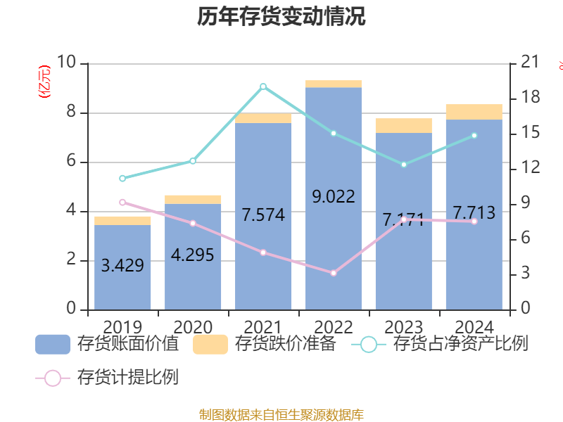 从存货变动来看,截至2024年末,公司存货账面价值为7.71亿元,占净资产的14.84%,较上年末增加5424.43万元。其中,存货跌价准备为6269.61万元,计提比例为7.52%。