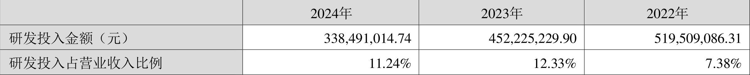 2024年全年,公司研发投入金额为3.38亿元,同比下降25.15%;研发投入占营业收入比例为11.24%,相比上年同期下降1.09个百分点。