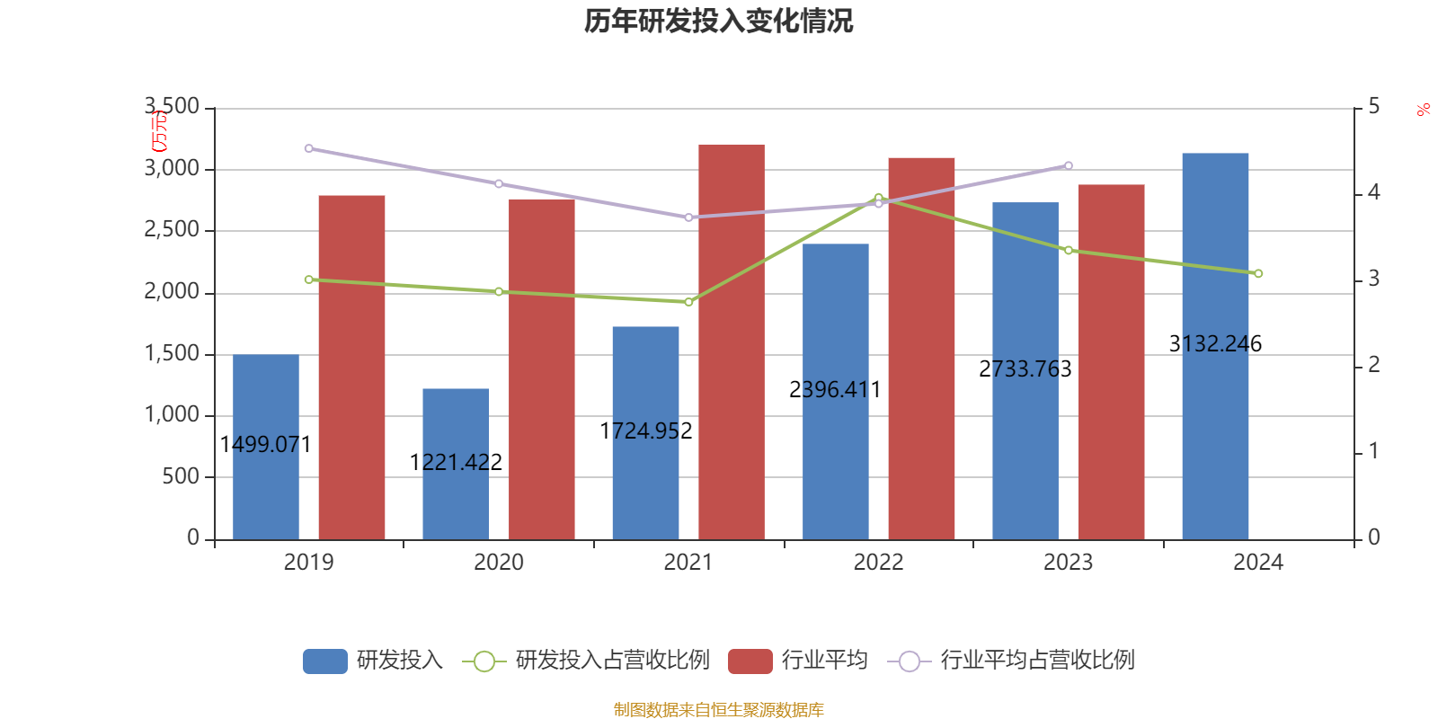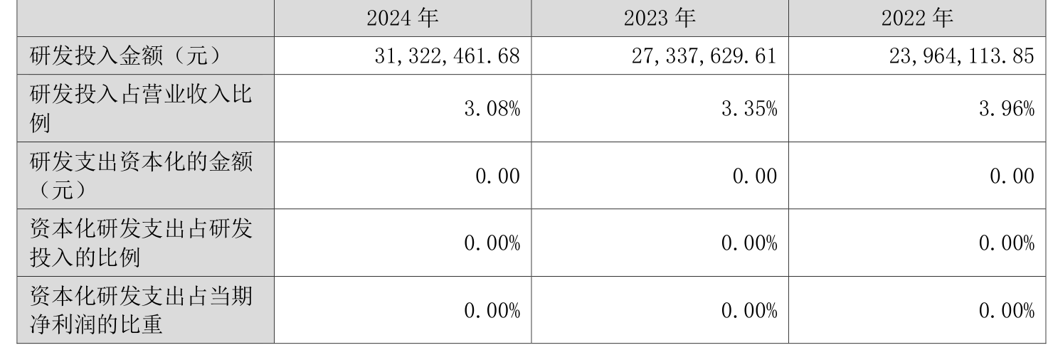 2024年全年,公司研发投入金额为3132.25万元,同比增长14.58%;研发投入占营业收入比例为3.08%,相比上年同期下降0.27个百分点。此外,公司全年研发投入资本化率为0%。