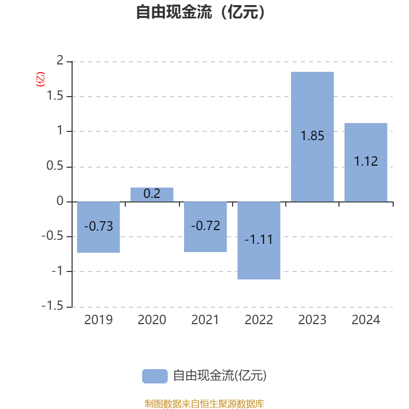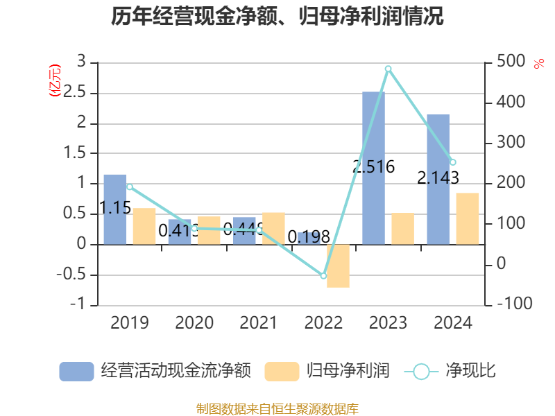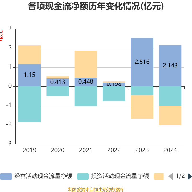 截至2024年,公司经营活动现金流净额为2.14亿元,同比下降14.83%;筹资活动现金流净额-1.01亿元,同比增加2215.32万元;投资活动现金流净额-1.02亿元,上年同期为-4558.77万元。