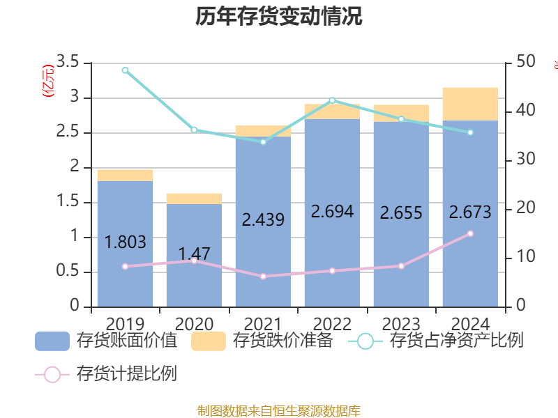 从存货变动来看,截至2024年末,公司存货账面价值为2.67亿元,占净资产的35.68%,较上年末增加186.35万元。其中,存货跌价准备为4700.71万元,计提比例为14.95%。