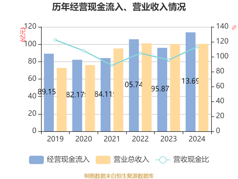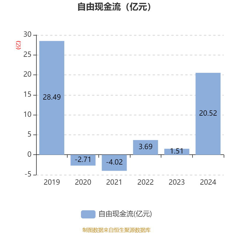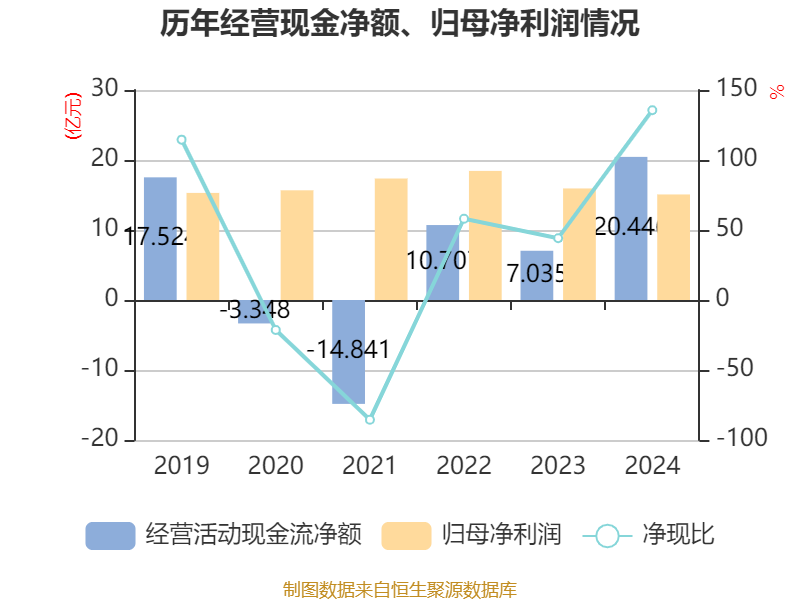 截至2024年,公司经营活动现金流净额为20.45亿元,同比增长190.62%;筹资活动现金流净额-4.96亿元,同比减少3.13亿元;投资活动现金流净额-2.79亿元,上年同期为-16.31亿元。