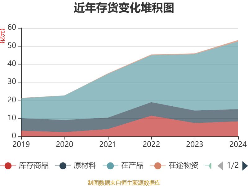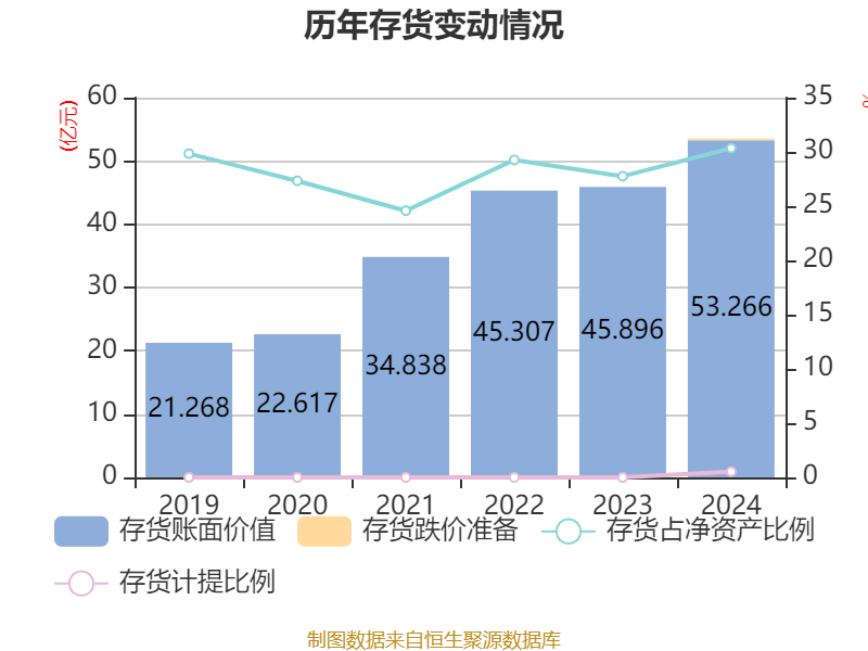 从存货变动来看,截至2024年末,公司存货账面价值为53.27亿元,占净资产的30.34%,较上年末增加7.37亿元。其中,存货跌价准备为2852.25万元,计提比例为0.53%。