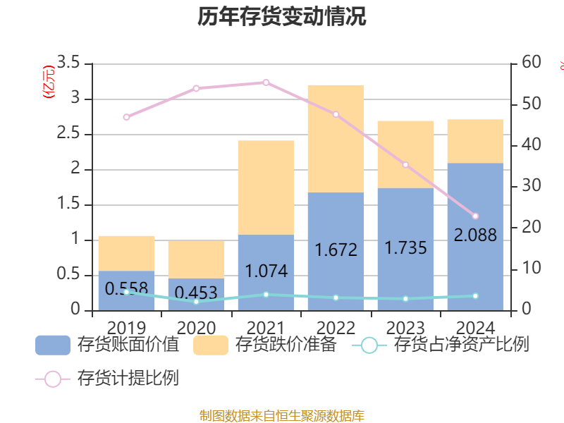 从存货变动来看,截至2024年末,公司存货账面价值为2.09亿元,占净资产的3.47%,较上年末增加3536.79万元。其中,存货跌价准备为6194.76万元,计提比例为22.88%。