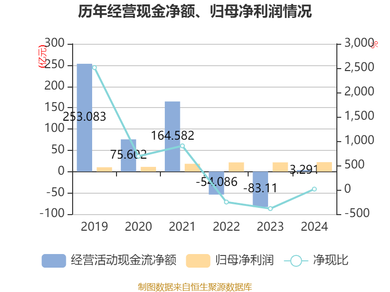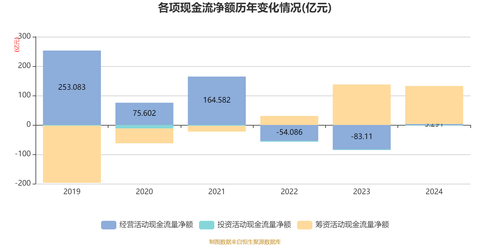 截至2024年,公司经营活动现金流净额为3.29亿元,同比增加86.4亿元;筹资活动现金流净额129.31亿元,同比减少8.41亿元;投资活动现金流净额-1.86亿元,上年同期为-2.27亿元。