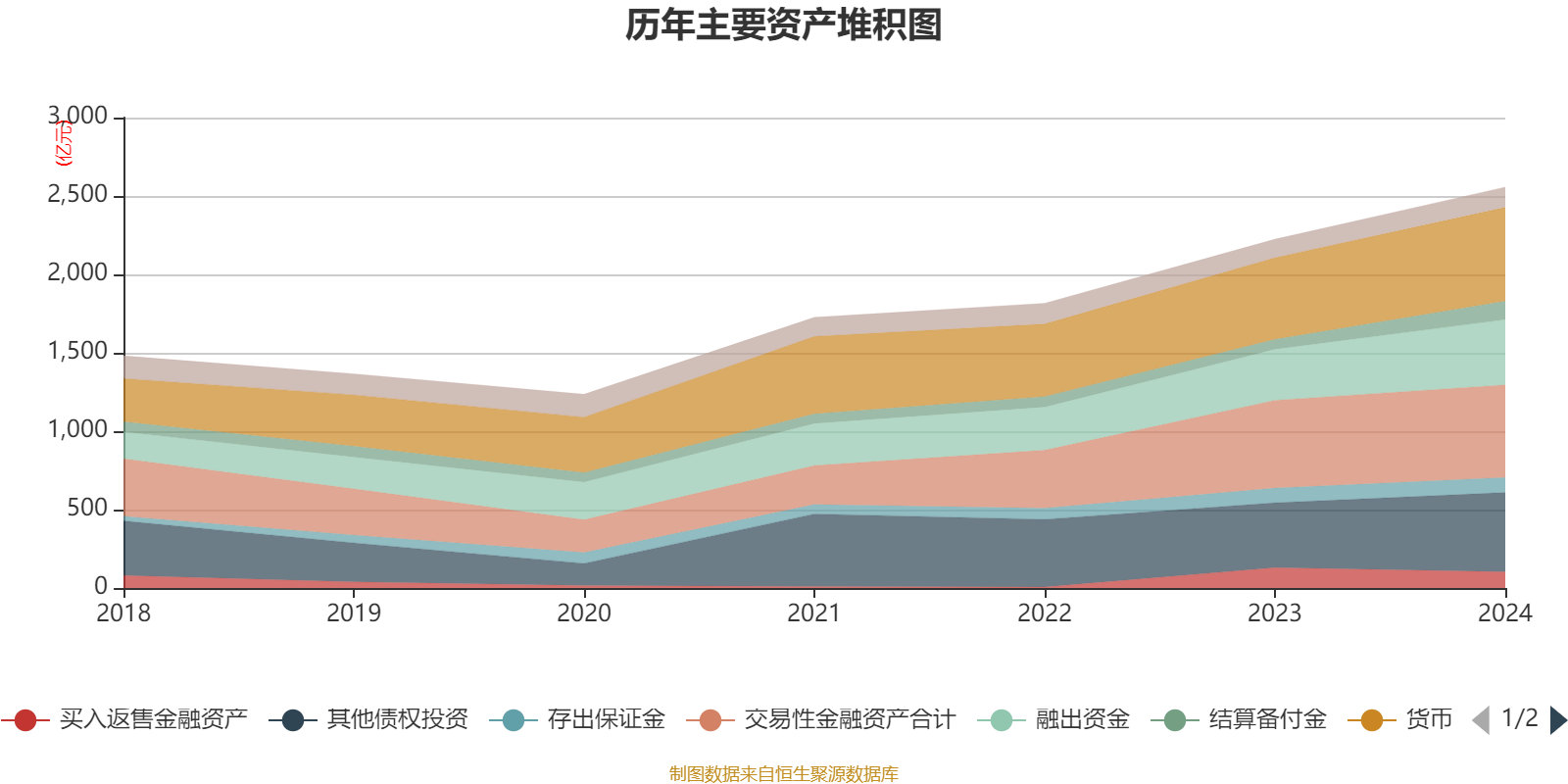 资产重大变化方面,截至2024年末,公司交易性金融资产合计较上年末增加5.31%,占公司总资产比重下降2.11个百分点;买入返售金融资产较上年末减少20.9%,占公司总资产比重下降1.81个百分点;结算备付金较上年末增加87.13%,占公司总资产比重上升1.79个百分点;融出资金较上年末增加27.99%,占公司总资产比重上升1.66个百分点。