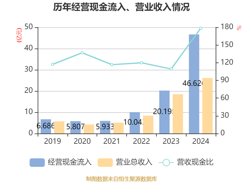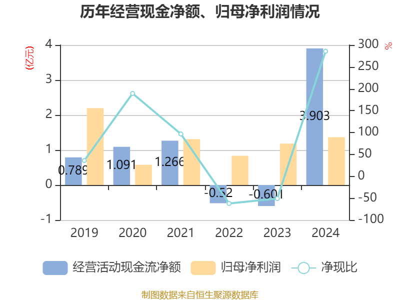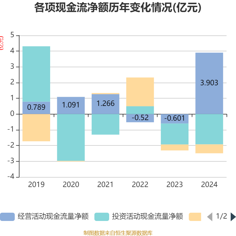 截至2024年,公司经营活动现金流净额为3.9亿元,同比增加4.5亿元;筹资活动现金流净额-5660.02万元,同比减少1876.42万元;投资活动现金流净额-1.93亿元,上年同期为-1.33亿元。