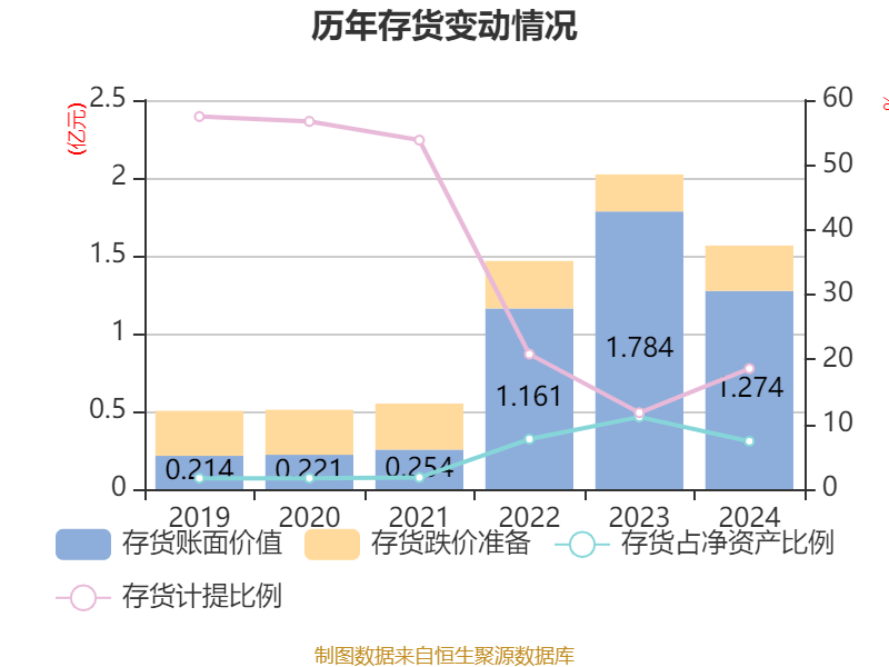 从存货变动来看,截至2024年末,公司存货账面价值为1.27亿元,占净资产的7.38%,较上年末减少5099.36万元。其中,存货跌价准备为2909.49万元,计提比例为18.59%。