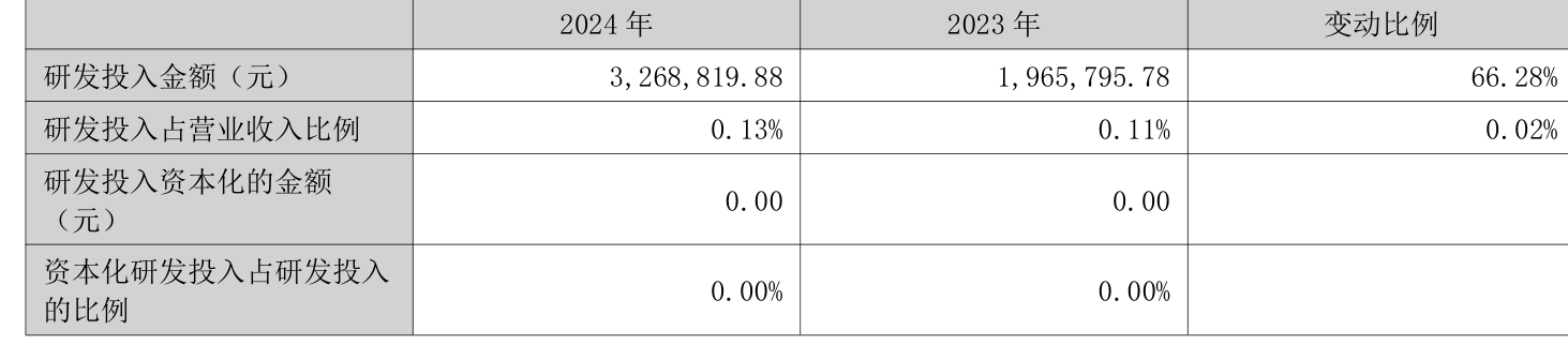 2024年全年,公司研发投入金额为326.88万元,同比增长66.28%;研发投入占营业收入比例为0.13%,相比上年同期上升0.02个百分点。此外,公司全年研发投入资本化率为0%。