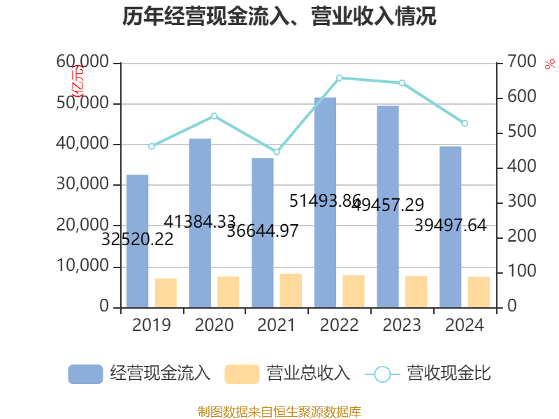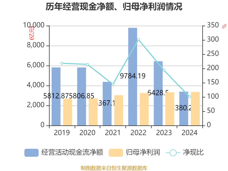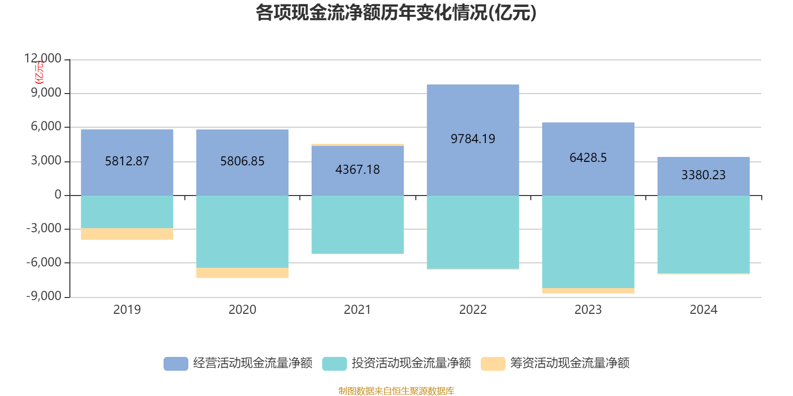 截至2024年,公司经营活动现金流净额为3380.23亿元,同比下降47.42%;筹资活动现金流净额-71.98亿元,同比增加401.29亿元;投资活动现金流净额-6926.32亿元,上年同期为-8212.54亿元。