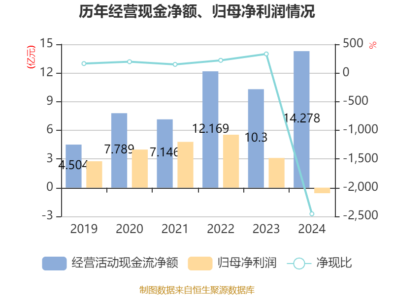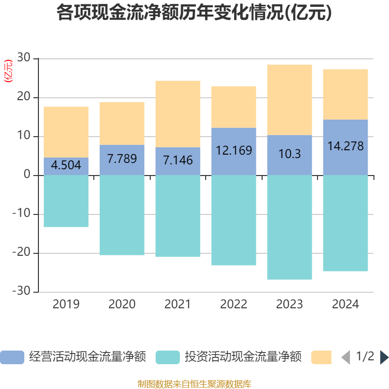 截至2024年,公司经营活动现金流净额为14.28亿元,同比增长38.62%;筹资活动现金流净额12.92亿元,同比减少5.17亿元;投资活动现金流净额-24.73亿元,上年同期为-26.87亿元。