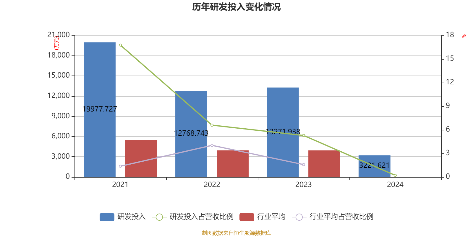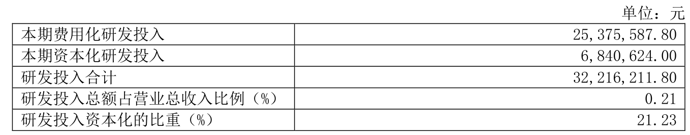 2024年全年,公司研发投入金额为3221.62万元,同比下降75.73%;研发投入占营业收入比例为0.21%,相比上年同期下降5.07个百分点。此外,公司全年研发投入资本化率为21.23%。