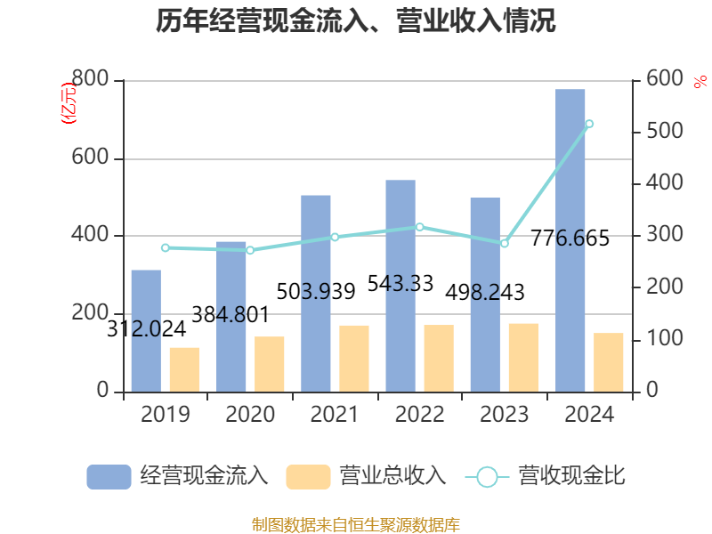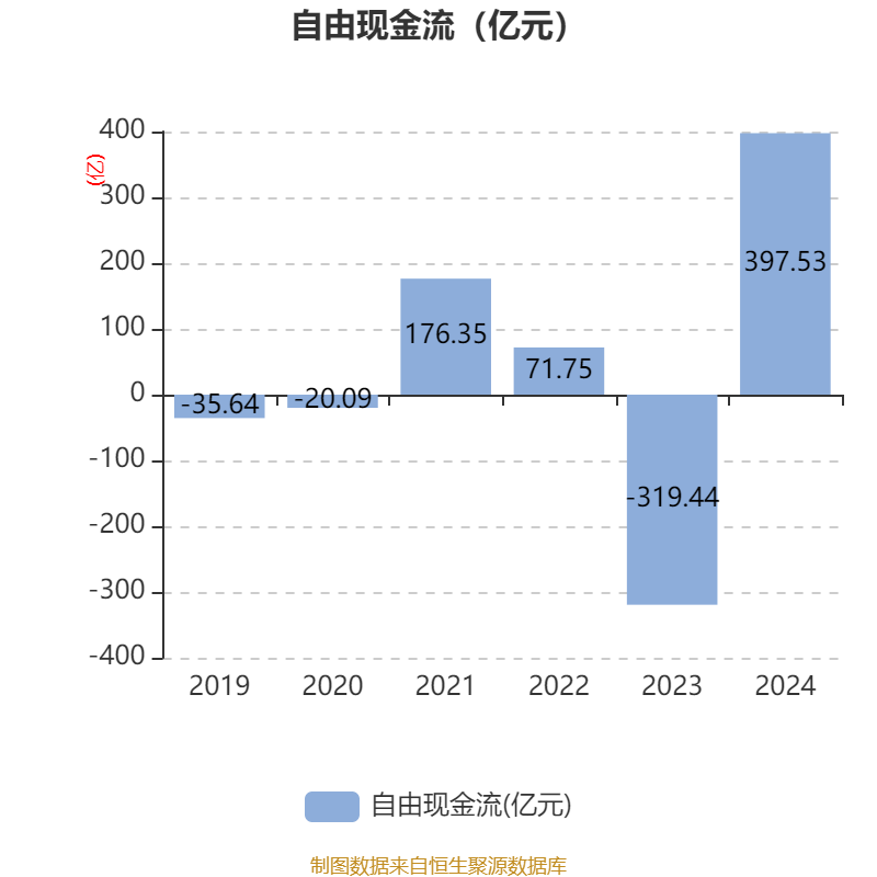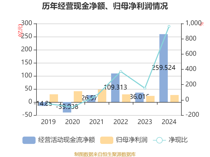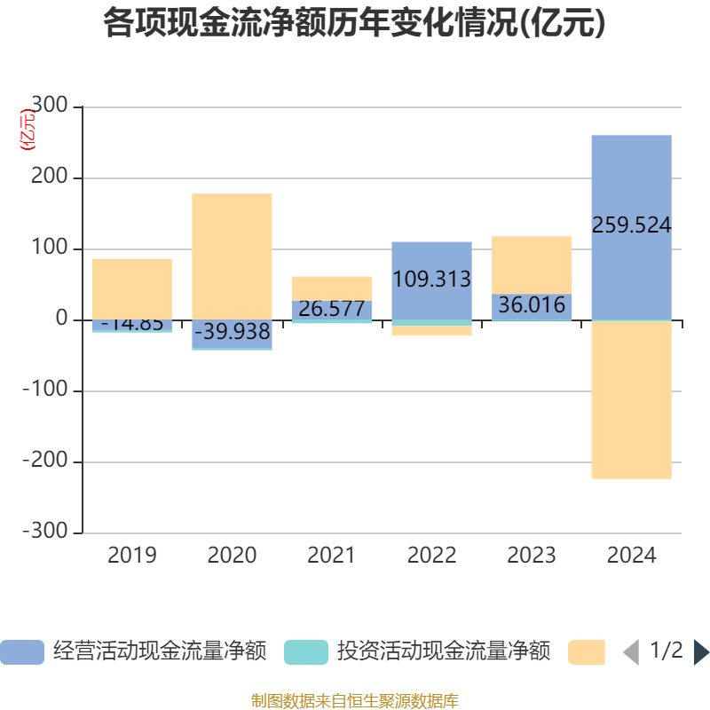 截至2024年,公司经营活动现金流净额为259.52亿元,同比增长620.57%;筹资活动现金流净额-221.8亿元,同比减少302.97亿元;投资活动现金流净额-2.89亿元,上年同期为-2.18亿元。