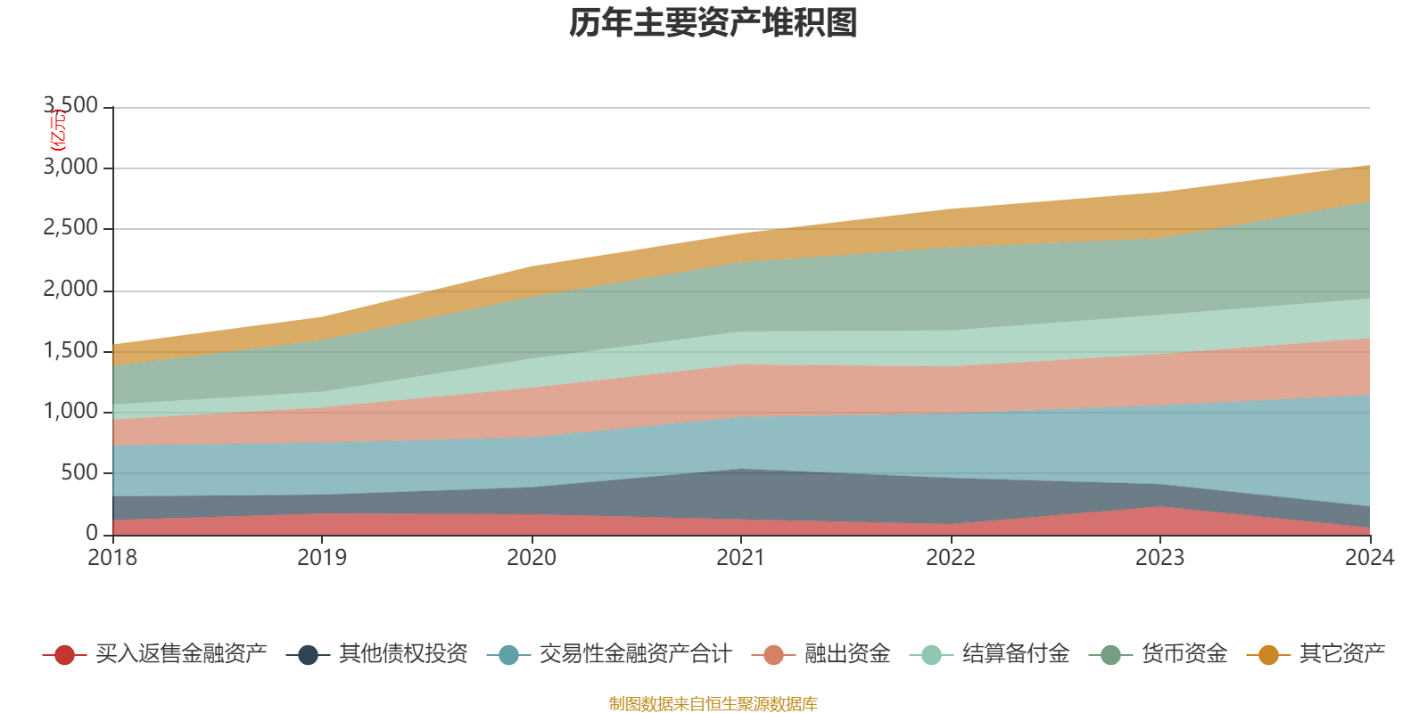 资产重大变化方面,截至2024年末,公司交易性金融资产合计较上年末增加41.27%,占公司总资产比重上升7.11个百分点;买入返售金融资产较上年末减少74.74%,占公司总资产比重下降6.34个百分点;货币资金较上年末增加26.64%,占公司总资产比重上升3.87个百分点;一年内到期的非流动资产较上年末减少90.33%,占公司总资产比重下降2.07个百分点。