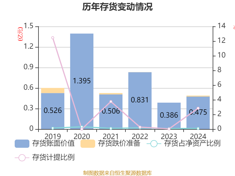 从存货变动来看,截至2024年末,公司存货账面价值为4754.95万元,占净资产的0.09%,较上年末增加899.57万元。其中,存货跌价准备为139.16万元,计提比例为2.84%。