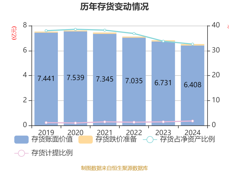 从存货变动来看,截至2024年末,公司存货账面价值为6.41亿元,占净资产的32.61%,较上年末减少3232.3万元。其中,存货跌价准备为1147.05万元,计提比例为1.76%。