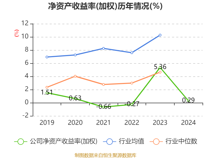 数据显示,2024年公司加权平均净资产收益率为0.29%,较上年同期下降5.07个百分点。公司2024年投入资本回报率为-0.29%,较上年同期下降5.37个百分点。