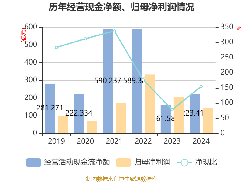 截至2024年,公司经营活动现金流净额为223.42亿元,同比增长38.27%;筹资活动现金流净额-123.86亿元,同比增加201.29亿元;投资活动现金流净额-97.26亿元,上年同期为-122.03亿元。