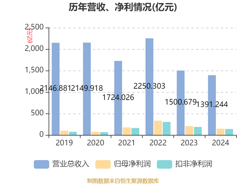 中证智能财讯兖矿能源(600188)3月29日披露2024年年度报告。2024年,公司实现营业总收入1391.24亿元,同比下降7.29%;归母净利润144.25亿元,同比下降28.39%;扣非净利润138.91亿元,同比下降25.28%;经营活动产生的现金流量净额为223.42亿元,同比增长38.27%;报告期内,兖矿能源基本每股收益为1.46元,加权平均净资产收益率为18.30%。公司2024年度分配预案为:拟向全体股东每10股派现5.4元(含税)。