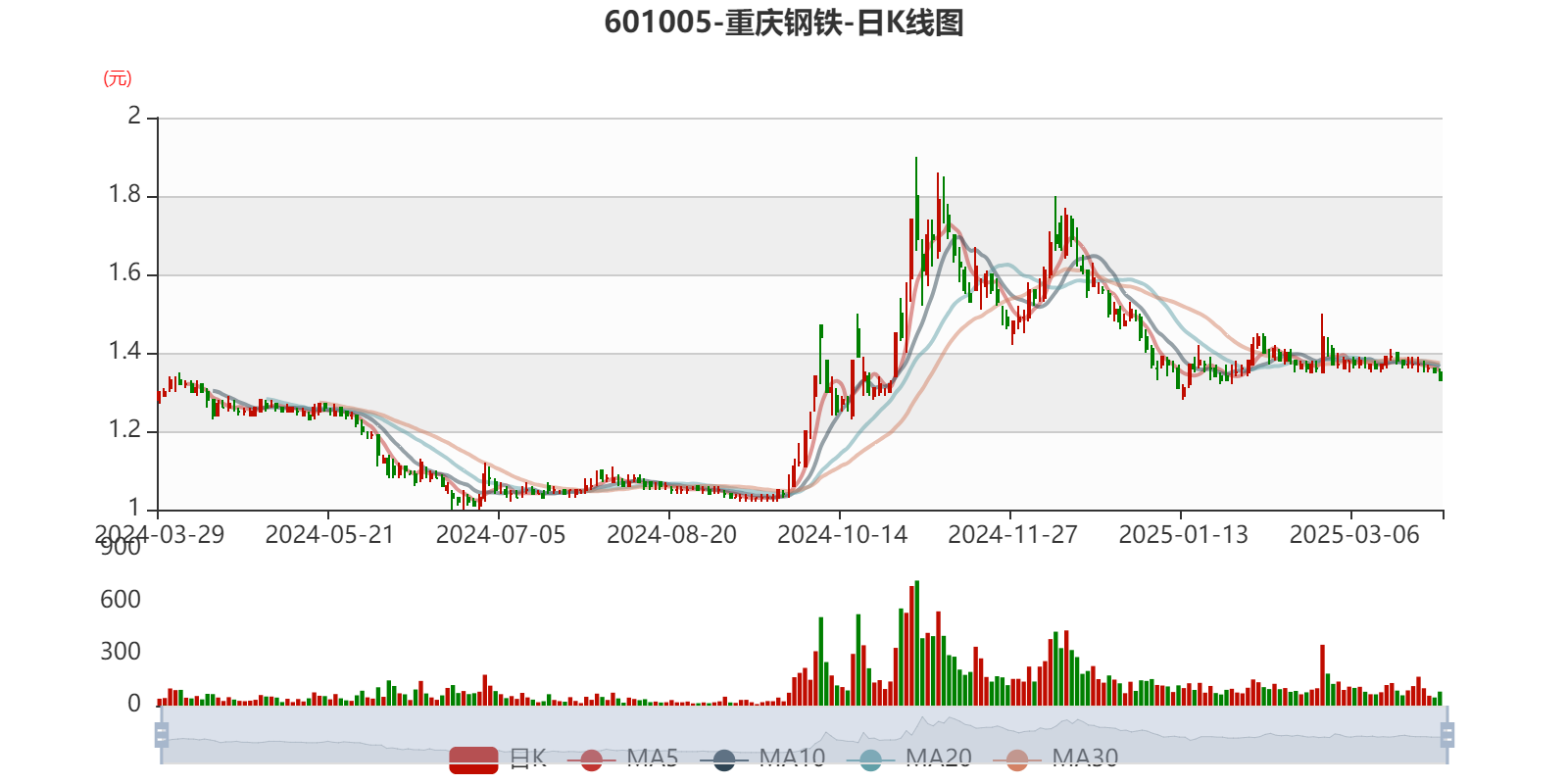 以3月28日收盘价计算,重庆钢铁目前市盈率(TTM)约为-3.68倍,市净率(LF)约0.71倍,市销率(TTM)约0.43倍。
