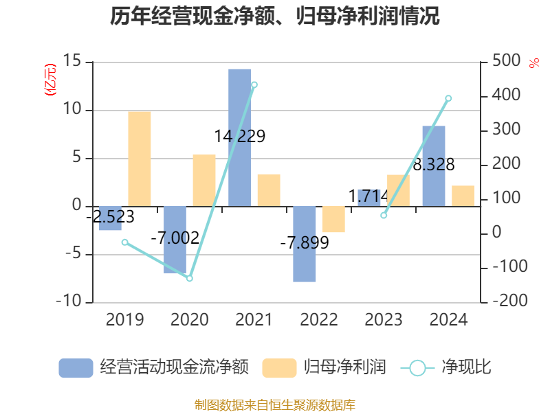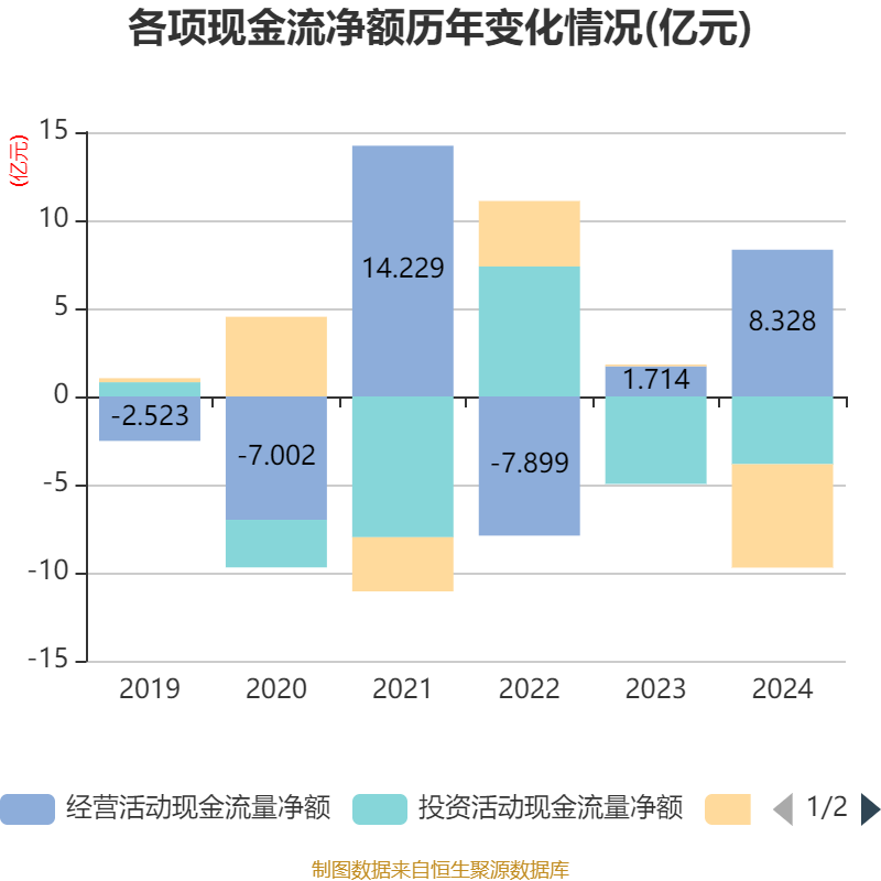 截至2024年,公司经营活动现金流净额为8.33亿元,同比增长385.81%;筹资活动现金流净额-5.87亿元,同比减少5.97亿元;投资活动现金流净额-3.85亿元,上年同期为-4.97亿元。