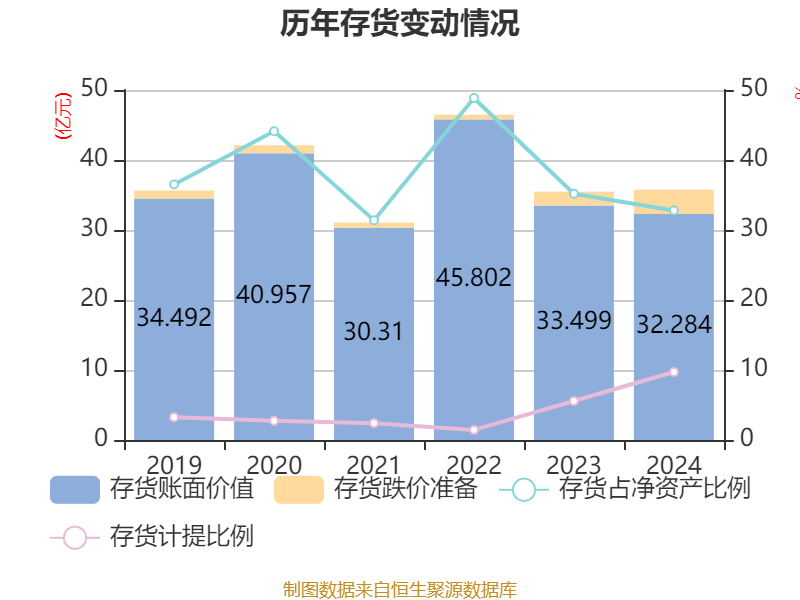 从存货变动来看,截至2024年末,公司存货账面价值为32.28亿元,占净资产的32.79%,较上年末减少1.22亿元。其中,存货跌价准备为3.48亿元,计提比例为9.72%。