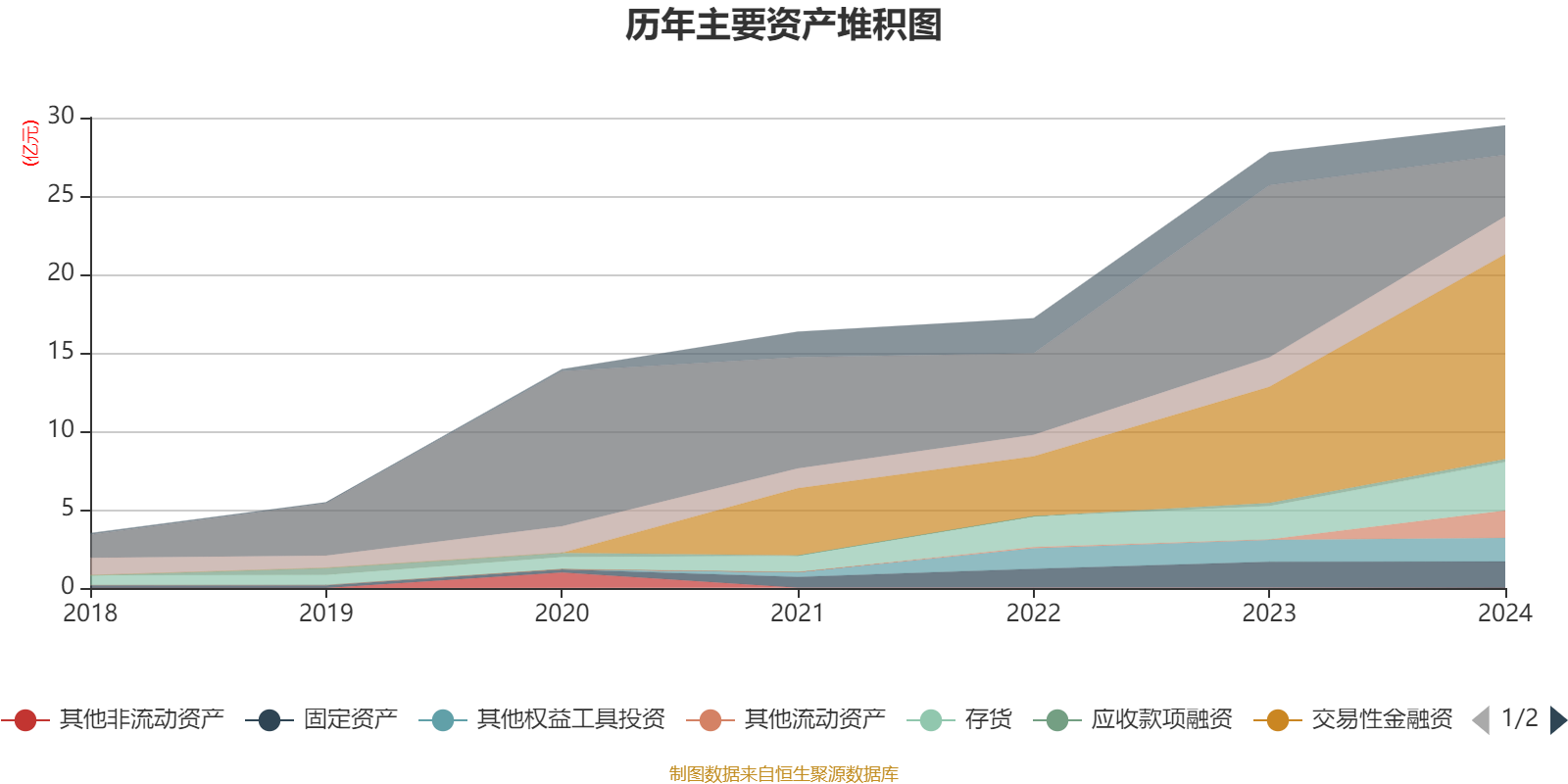 资产重大变化方面,截至2024年末,公司货币资金较上年末减少64.26%,占公司总资产比重下降26.22个百分点;交易性金融资产合计较上年末增加76.36%,占公司总资产比重上升17.63个百分点;其他流动资产较上年末增加7727.67%,占公司总资产比重上升5.85个百分点;存货较上年末增加45.06%,占公司总资产比重上升2.81个百分点。