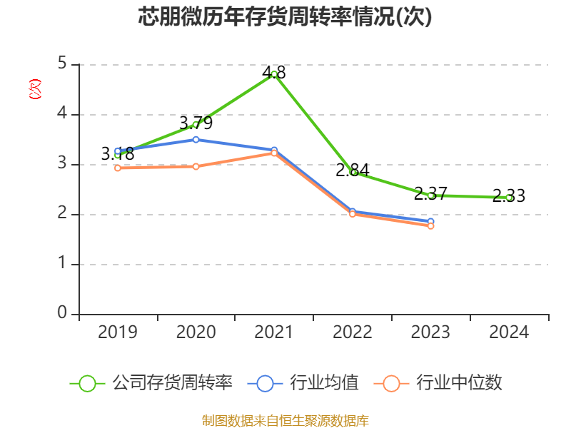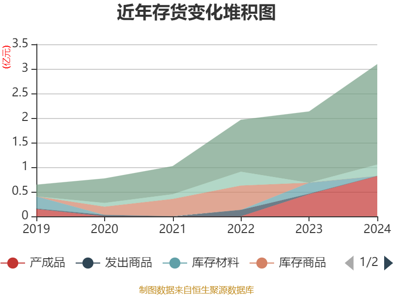从存货变动来看,截至2024年末,公司存货账面价值为3.09亿元,占净资产的12.42%,较上年末增加9611.7万元。其中,存货跌价准备为4566.11万元,计提比例为12.86%。