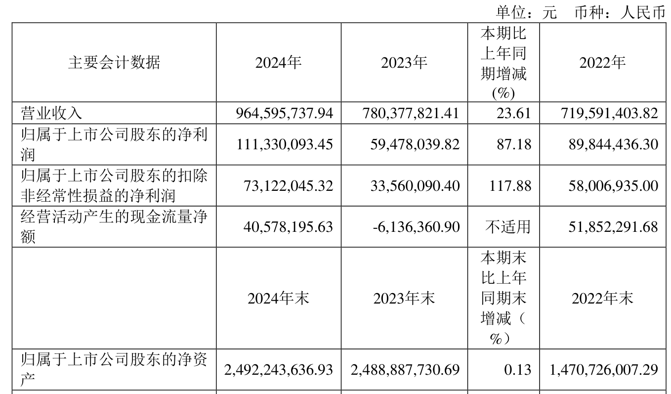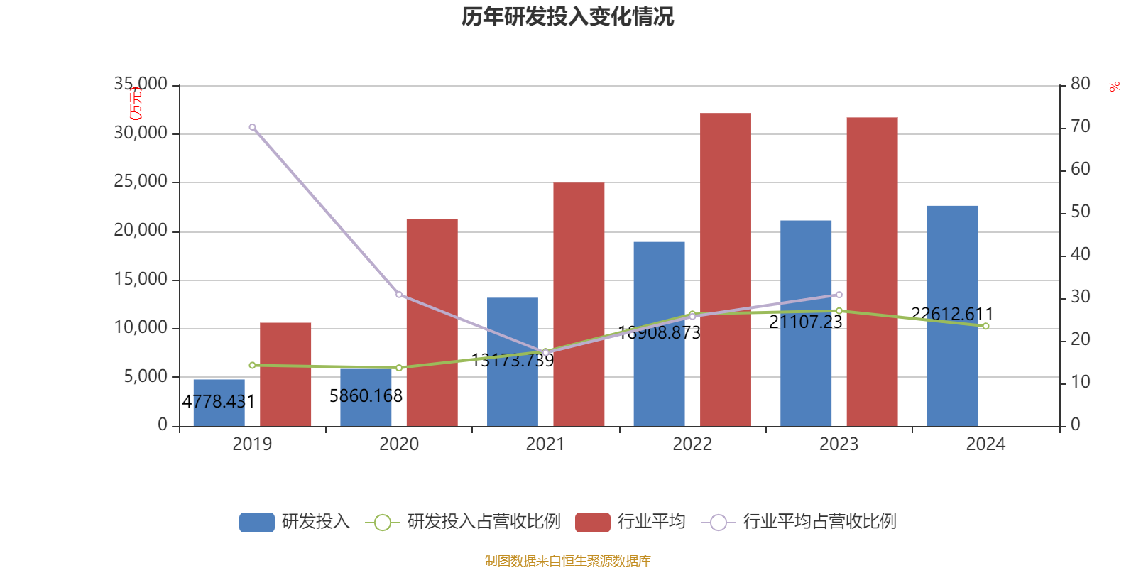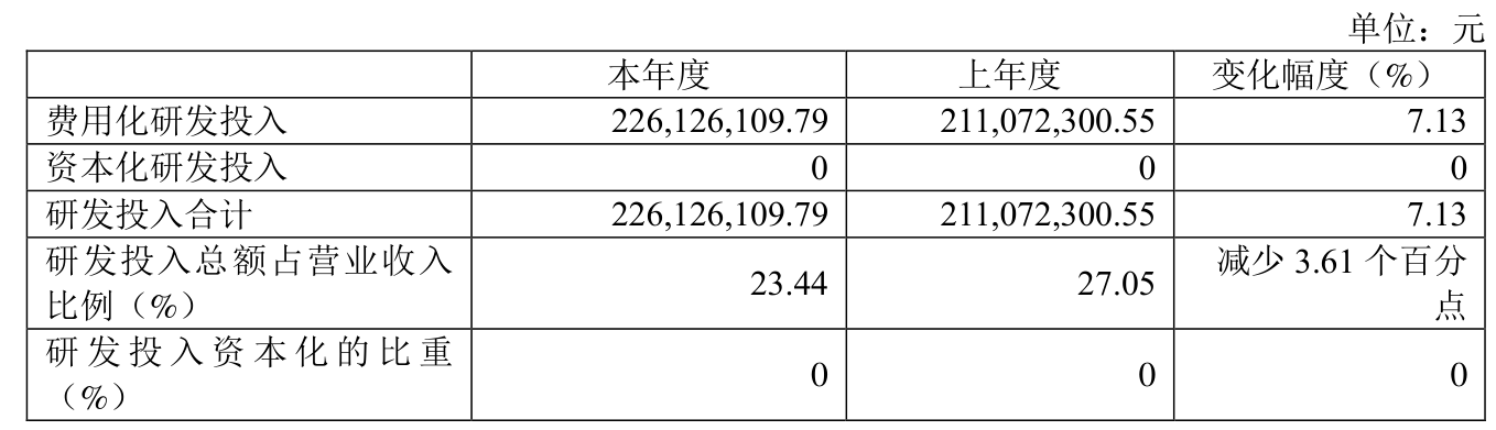 2024年全年,公司研发投入金额为2.26亿元,同比增长7.13%;研发投入占营业收入比例为23.44%,相比上年同期下降3.61个百分点。此外,公司全年研发投入资本化率为0%。
