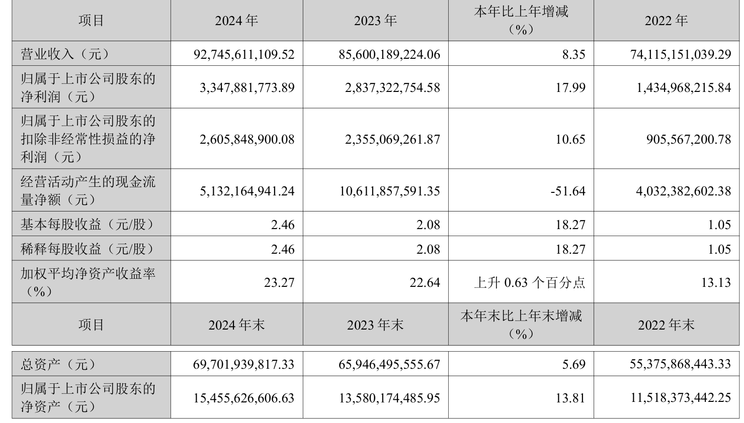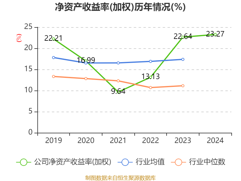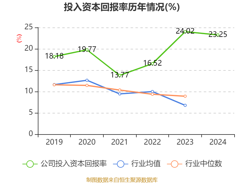 数据显示,2024年公司加权平均净资产收益率为23.27%,较上年同期上升0.63个百分点。公司2024年投入资本回报率为23.25%,较上年同期下降0.77个百分点。
