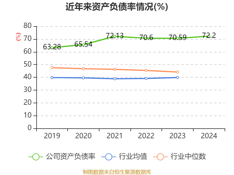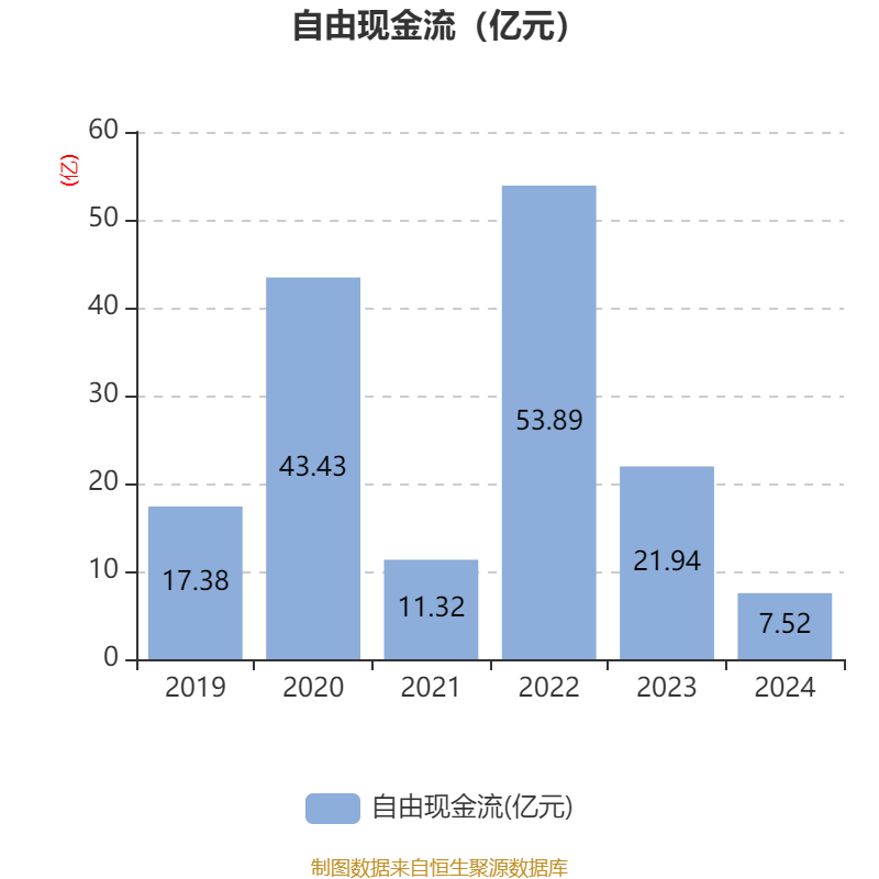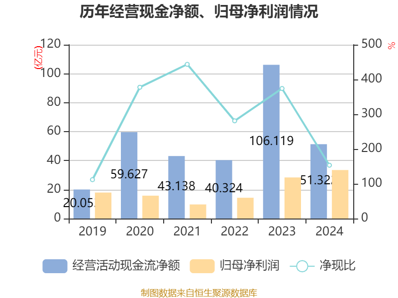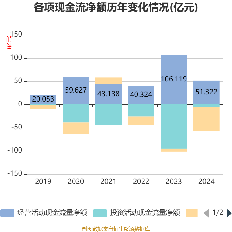 截至2024年,公司经营活动现金流净额为51.32亿元,同比下降51.64%;筹资活动现金流净额-51.21亿元,同比减少45亿元;投资活动现金流净额-6.19亿元,上年同期为-95.57亿元。
