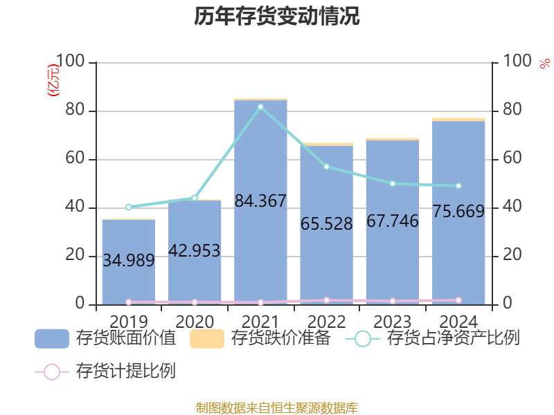从存货变动来看,截至2024年末,公司存货账面价值为75.67亿元,占净资产的48.96%,较上年末增加7.92亿元。其中,存货跌价准备为1.3亿元,计提比例为1.68%。
