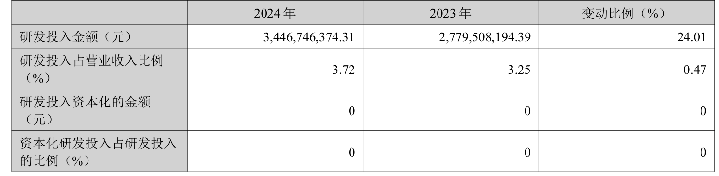 2024年全年,公司研发投入金额为34.47亿元,同比增长24.01%;研发投入占营业收入比例为3.72%,相比上年同期上升0.47个百分点。此外,公司全年研发投入资本化率为0%。