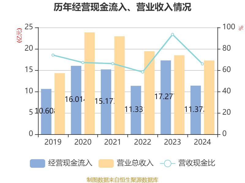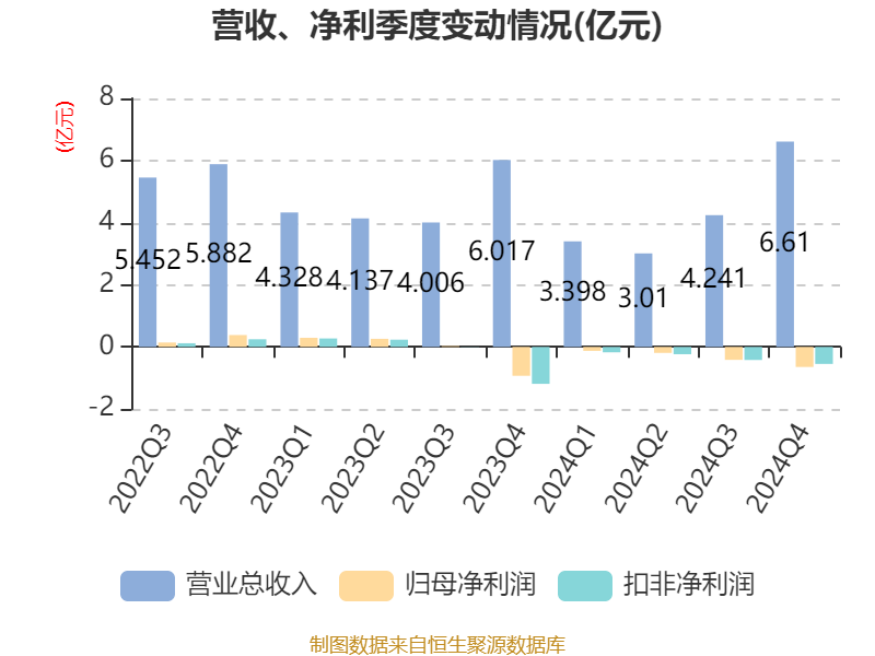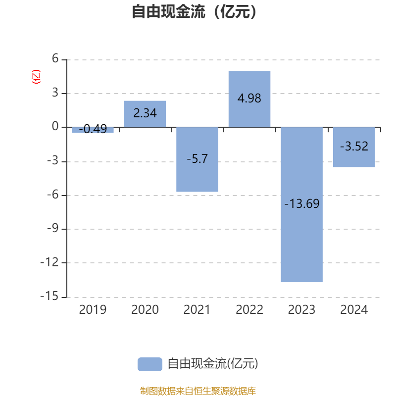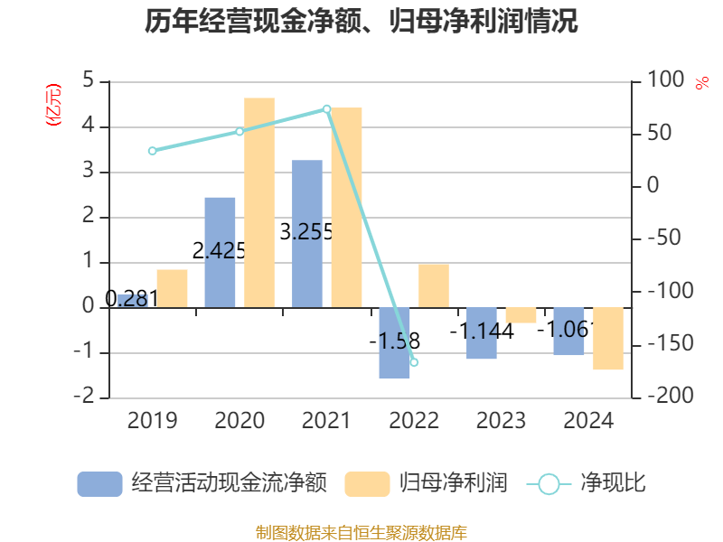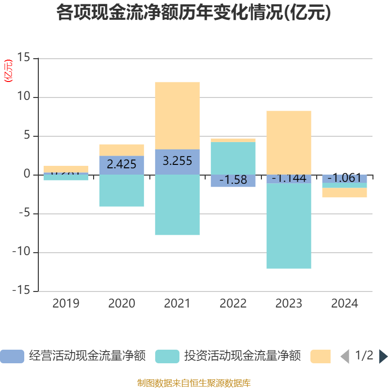 截至2024年,公司经营活动现金流净额为-1.06亿元,同比增加830.96万元;筹资活动现金流净额-1.21亿元,同比减少9.42亿元;投资活动现金流净额-6555.15万元,上年同期为-10.97亿元。