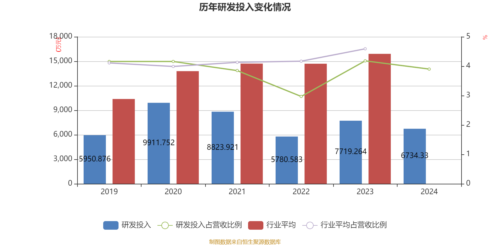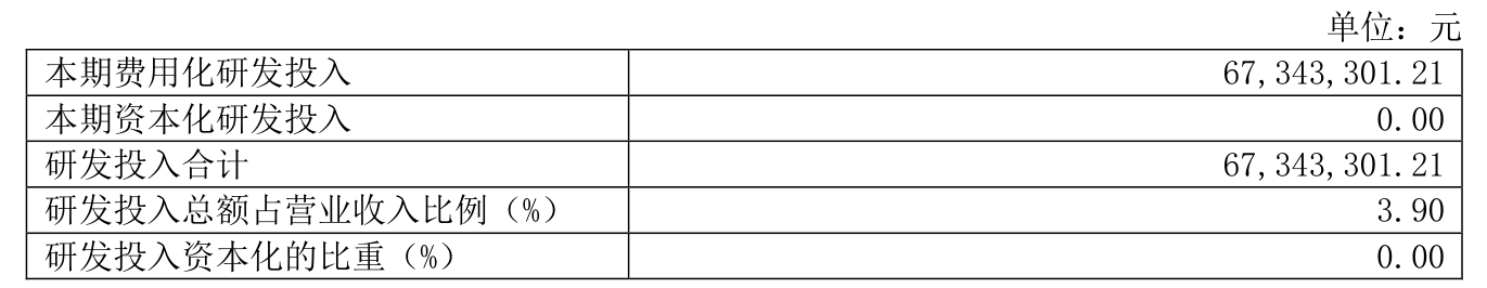 2024年全年,公司研发投入金额为6734.33万元,同比下降12.76%;研发投入占营业收入比例为3.9%,相比上年同期下降0.28个百分点。此外,公司全年研发投入资本化率为0%。