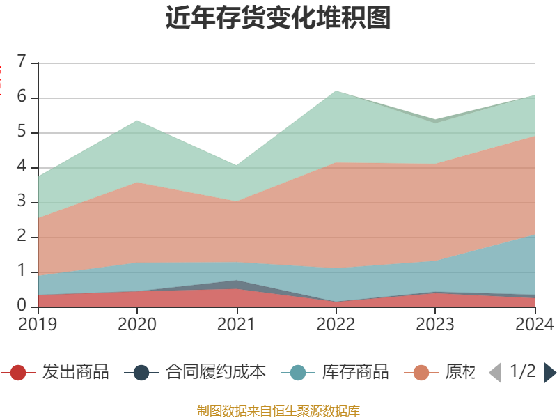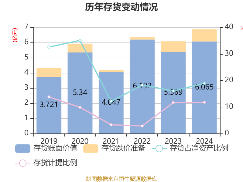 从存货变动来看,截至2024年末,公司存货账面价值为6.07亿元,占净资产的18.91%,较上年末增加6960.86万元。其中,存货跌价准备为8062.4万元,计提比例为11.73%。