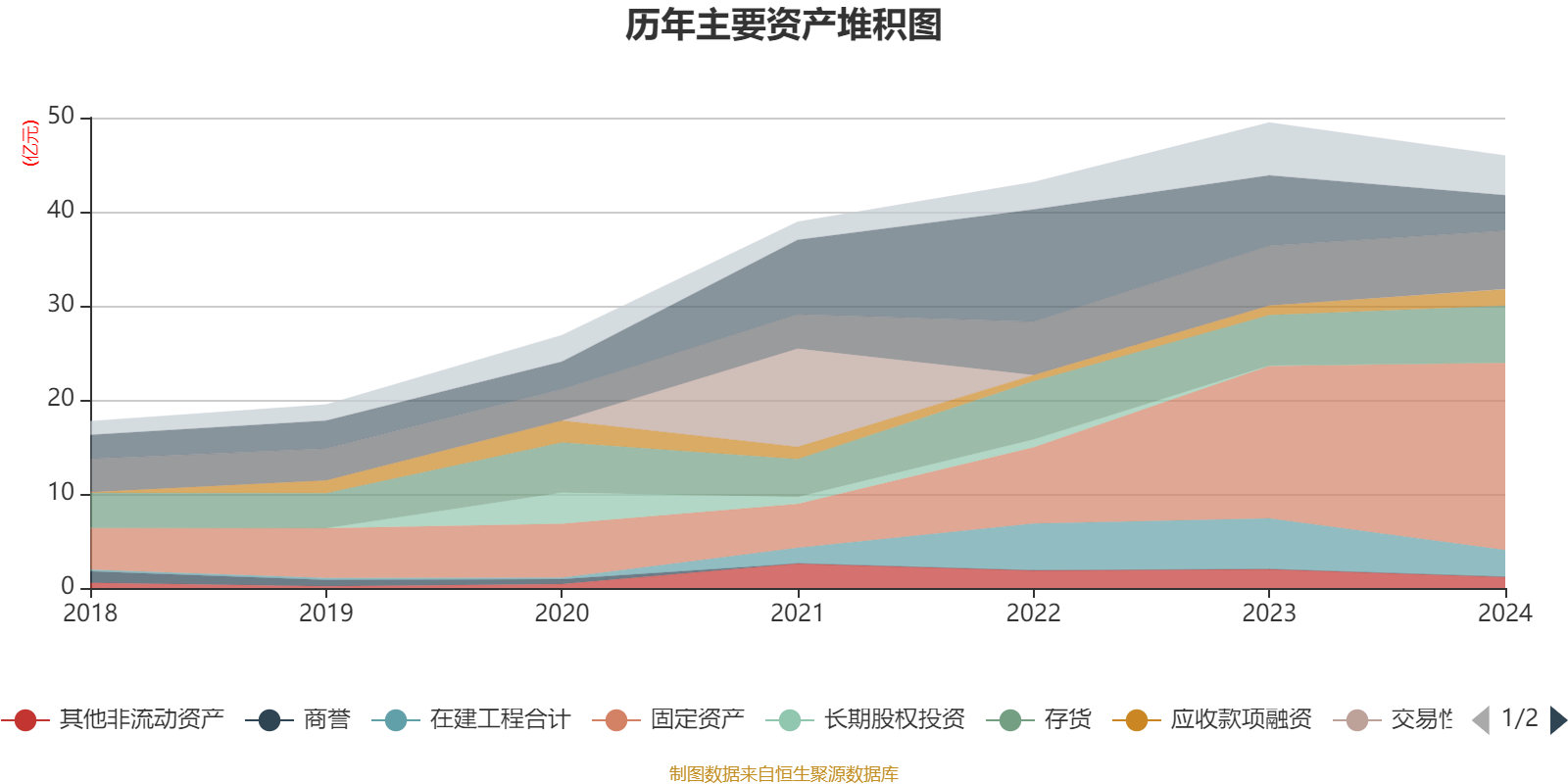 资产重大变化方面,截至2024年末,公司固定资产较上年末增加22.81%,占公司总资产比重上升10.53个百分点;货币资金较上年末减少49.77%,占公司总资产比重下降6.95个百分点;在建工程合计较上年末减少47.23%,占公司总资产比重下降4.72个百分点;其他应收款(含利息和股利)较上年末减少96.99%,占公司总资产比重下降3.72个百分点。