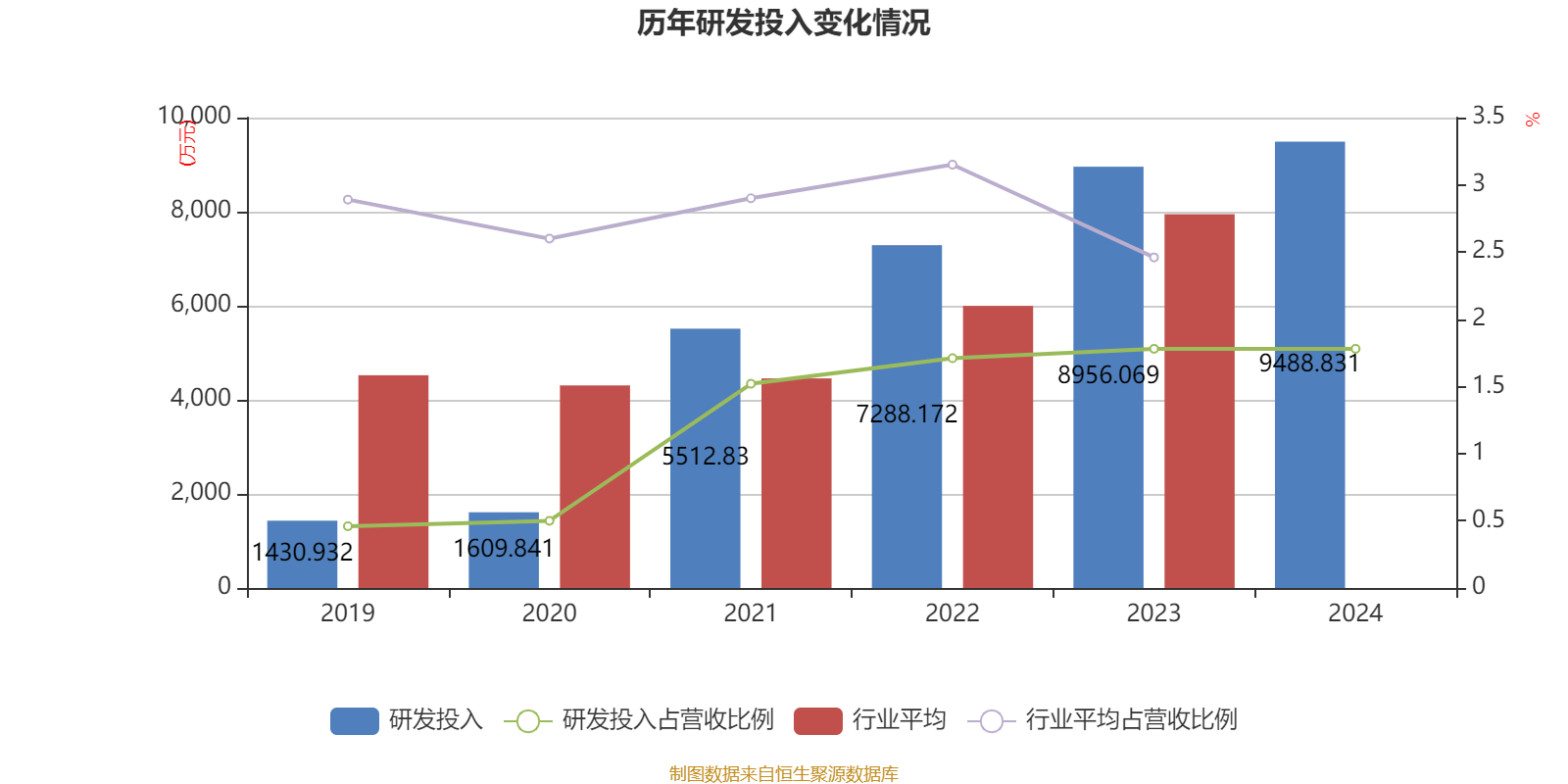 2024年全年,公司研发投入金额为9488.83万元,同比增长5.95%;研发投入占营业收入比例为1.78%,相比上年同期持平。此外,公司全年研发投入资本化率为0%。