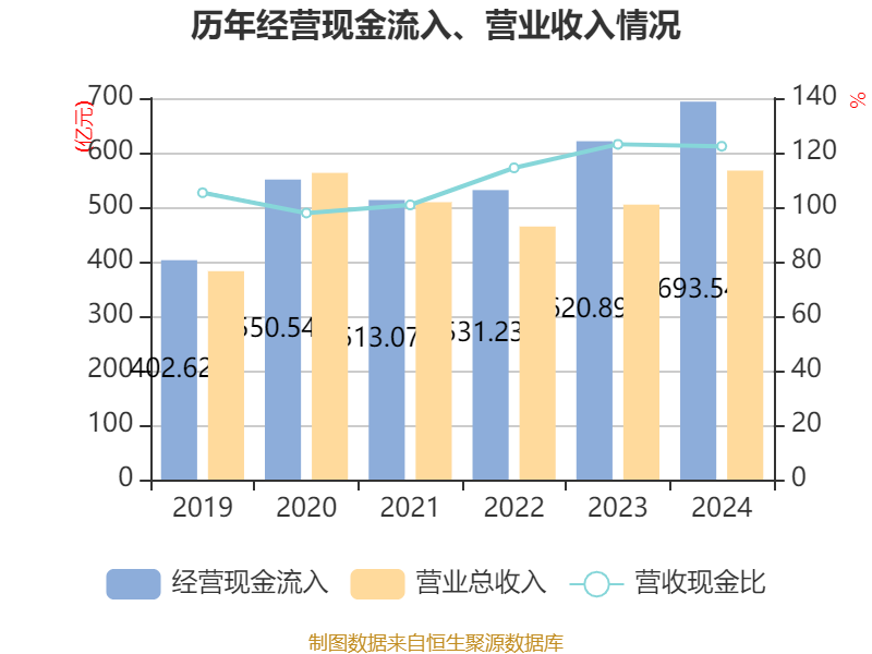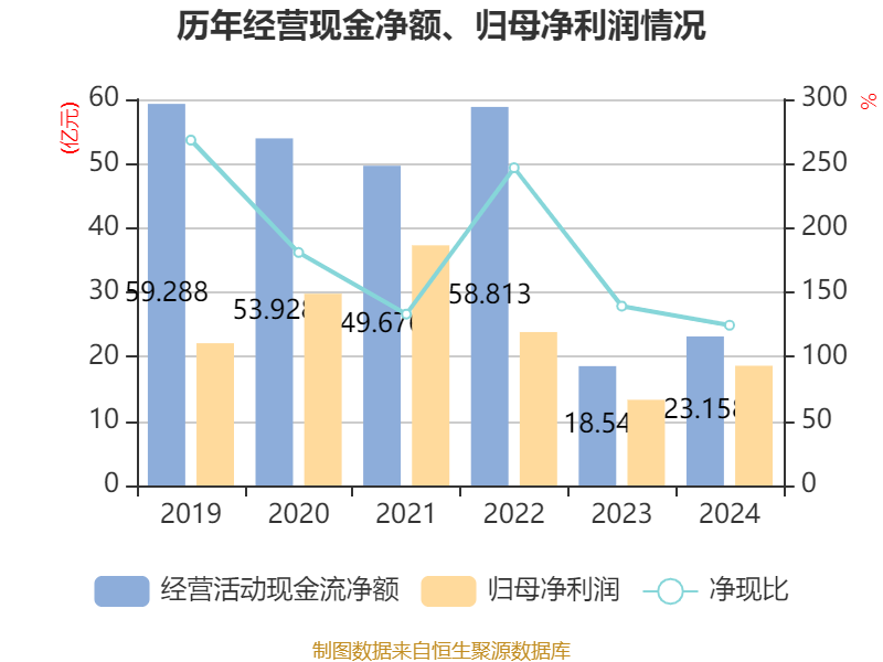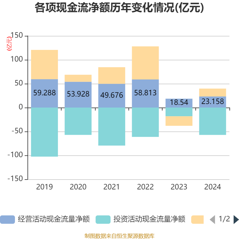 截至2024年,公司经营活动现金流净额为23.16亿元,同比增长24.91%;筹资活动现金流净额16.5亿元,同比增加36.43亿元;投资活动现金流净额-57.24亿元,上年同期为-18.24亿元。
