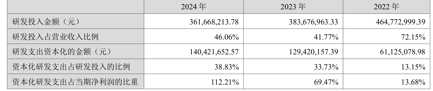 2024年全年,公司研发投入金额为3.62亿元,同比下降5.74%;研发投入占营业收入比例为46.06%,相比上年同期上升4.29个百分点。此外,公司全年研发投入资本化率为38.83%。